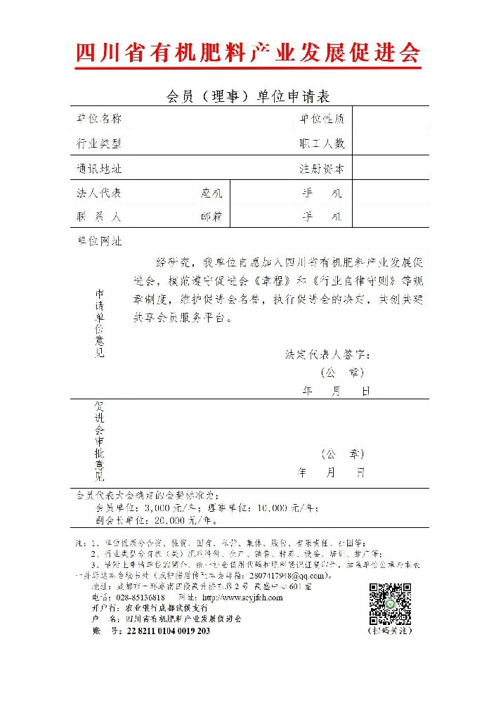 请附上申请单位的简介、统一社会信用代码和肥料登记证复印件,加盖单位公章与本表一并送达本会秘书处(或扫描后传至本会邮箱:2807417948@qq.com)。地址:成都市一环路南四段高升桥东路2号 高盛中心601室